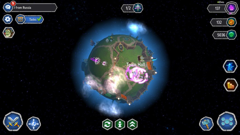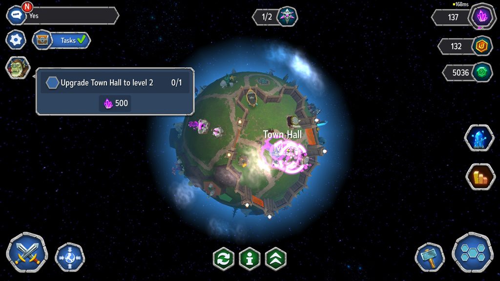 Le petit bouton avec le monde vous permettra de vous rendre directement sur la vue de votre personnage dans la map, à gauche en haut, il s’agit des cristaux qui vous permettront de faire level up les bâtiments, en dessous l’argent pour acheter des personnages si je ne trompe pas et les émeraudes d’accélérer les upgrades des bâtiments ou acheter des coffres qui vous permettront de faire évoluer les performances de votre personnage ou avoir des pièces.