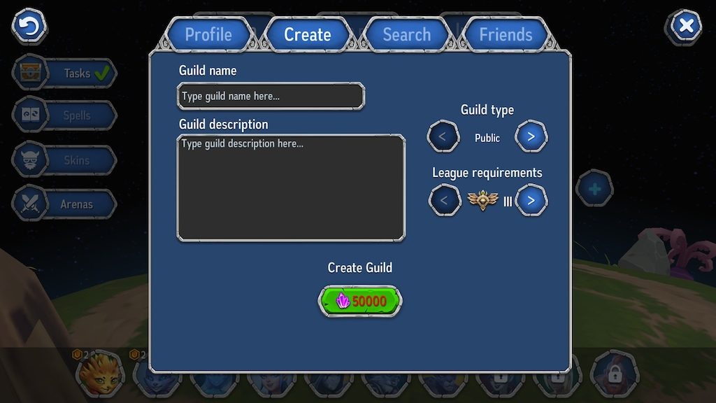 Par la même occupation c’est par ici que vous pourrez créer votre clan, pour cela cliquez sur le « + » à droite ou à gauche puis cliquez en haut « create », vous pourrez choisir si vous souhaitez qu’elle soit publique ou privée et les ranks requit pour rejoindre celle-ci, puis payer 50 000 cristaux. N’oubliez pas le nom de la Guilde et la description évidemment.
