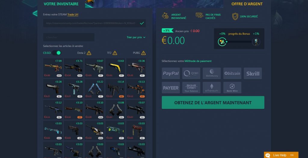 ATTENTION : Entre le site et le marché Steam les skins ont une valeur totalement différente et il vous sera déduit une somme pour la transaction par conséquent vous n’aurez pas tout à fait la somme que vous voyez s’afficher à droite en gros.