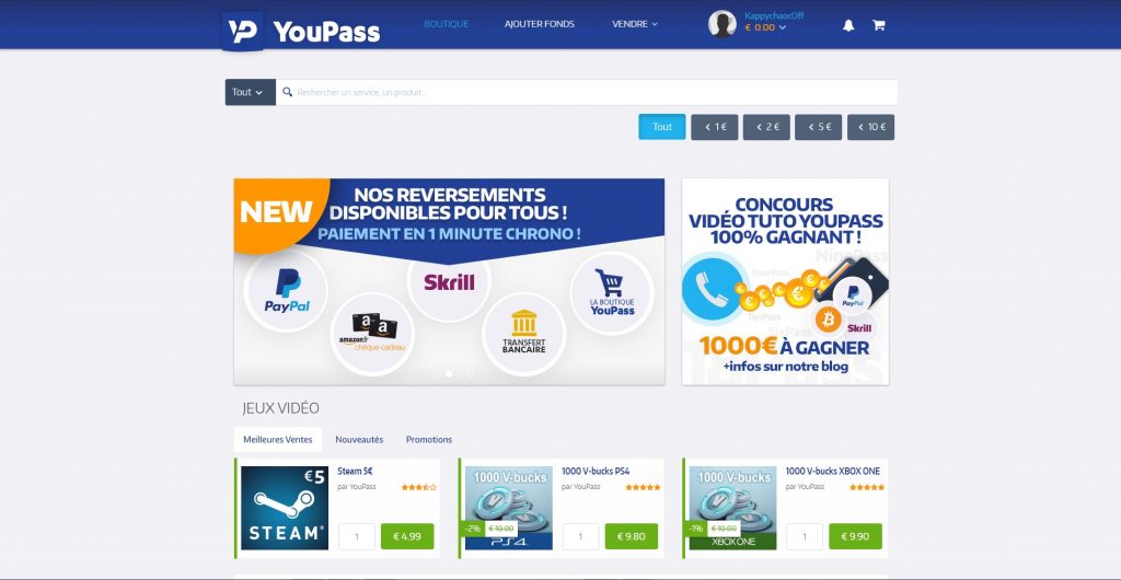 Youpass a été créé en 2011, comme je le disais juste au-dessus, celui-ci vous permettra en un seul coup de fil à un numéro surtaxé de pouvoir transformer l’argent de forfait en monnaie virtuelle, avec cet argent vous allez ensuite pouvoir acheter des choses comme par exemple des jeux, des V-bucks pour Fornite ou encore de l’argent pour Steam.