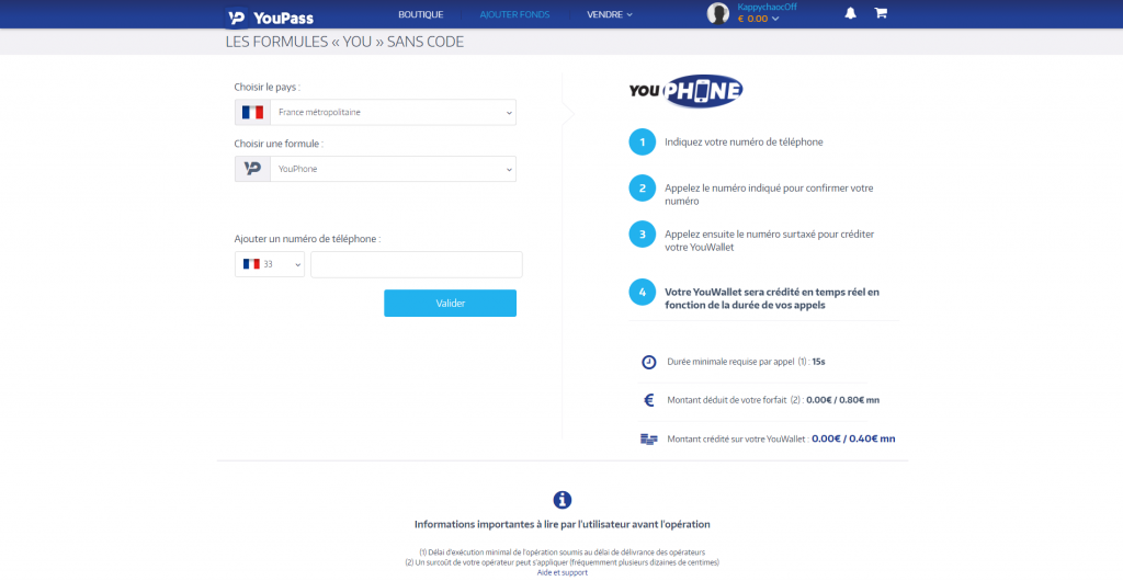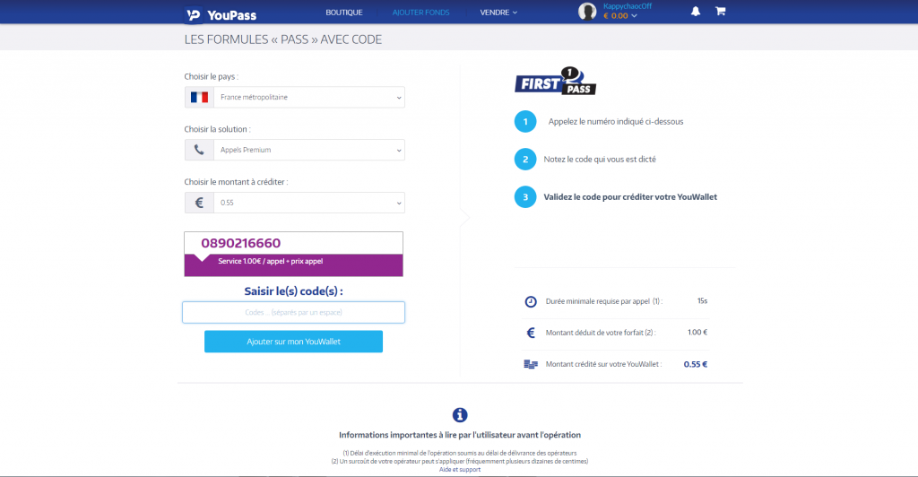 Vous aurez le choix entre deux offres, « You » qui vous permet une fois l’appelle passé de directement crédité sur votre compte l’argent transformé ou alors la formule « Pass », vous recevrez pendant votre coup de fil un code à rentrer directement après avoir raccroché !