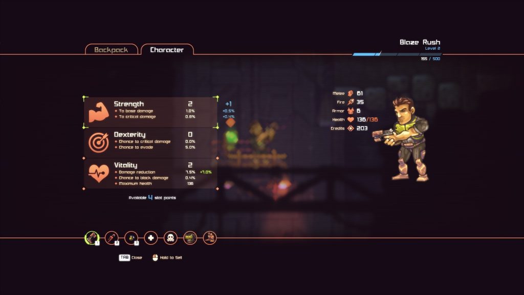Lorsque vous aurez des points de compétences disponibles, vous verrez un message « new level » apparaître, il suffira d’appuyer sur le bouton qui vous permet d’ouvrir votre inventaire (ou tab), puis en haut à gauche sur « character ».